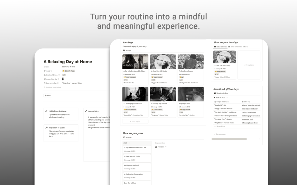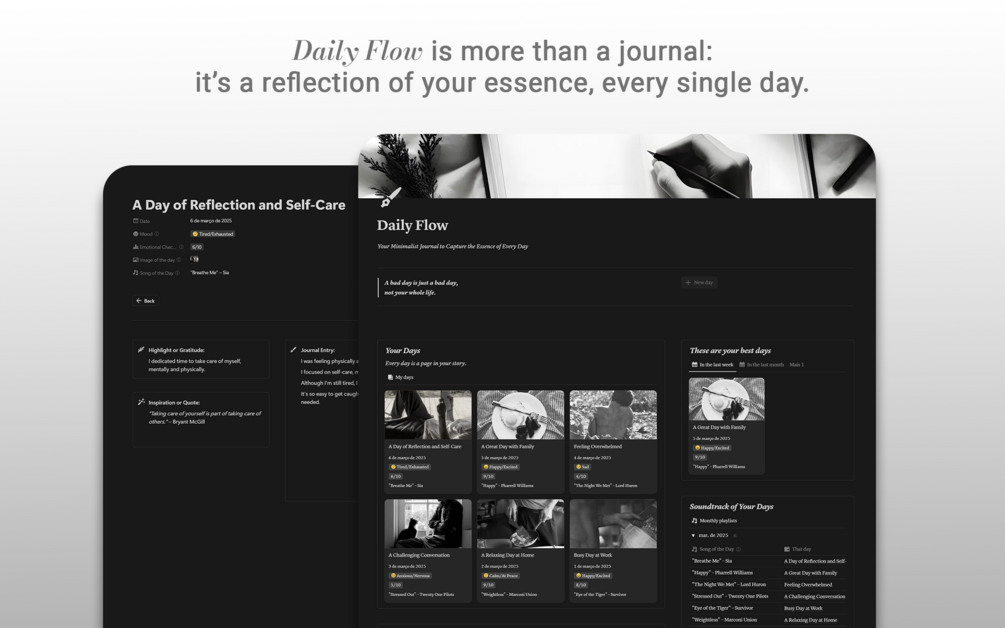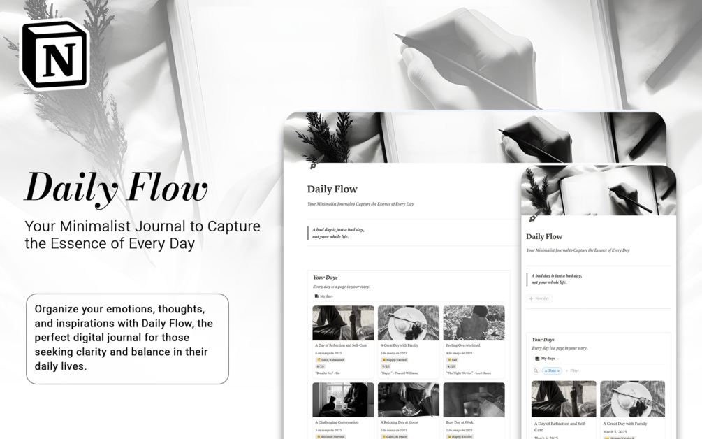 Organize your emotions, thoughts, and inspirations with Daily Flow, the perfect digital journal for those seeking clarity and balance in their daily lives. With a clean and intuitive design. Turn your routine into a mindful and meaningful experience. Daily Flow is more than a journal: it’s a reflection of your essence, every single day.