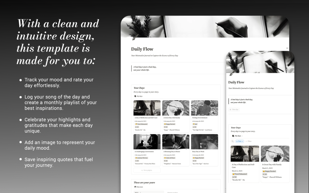 Transform the way you reflect on your days with Daily Flow, the ultimate minimalist Notion template. Designed for simplicity and mindfulness, this template helps you: